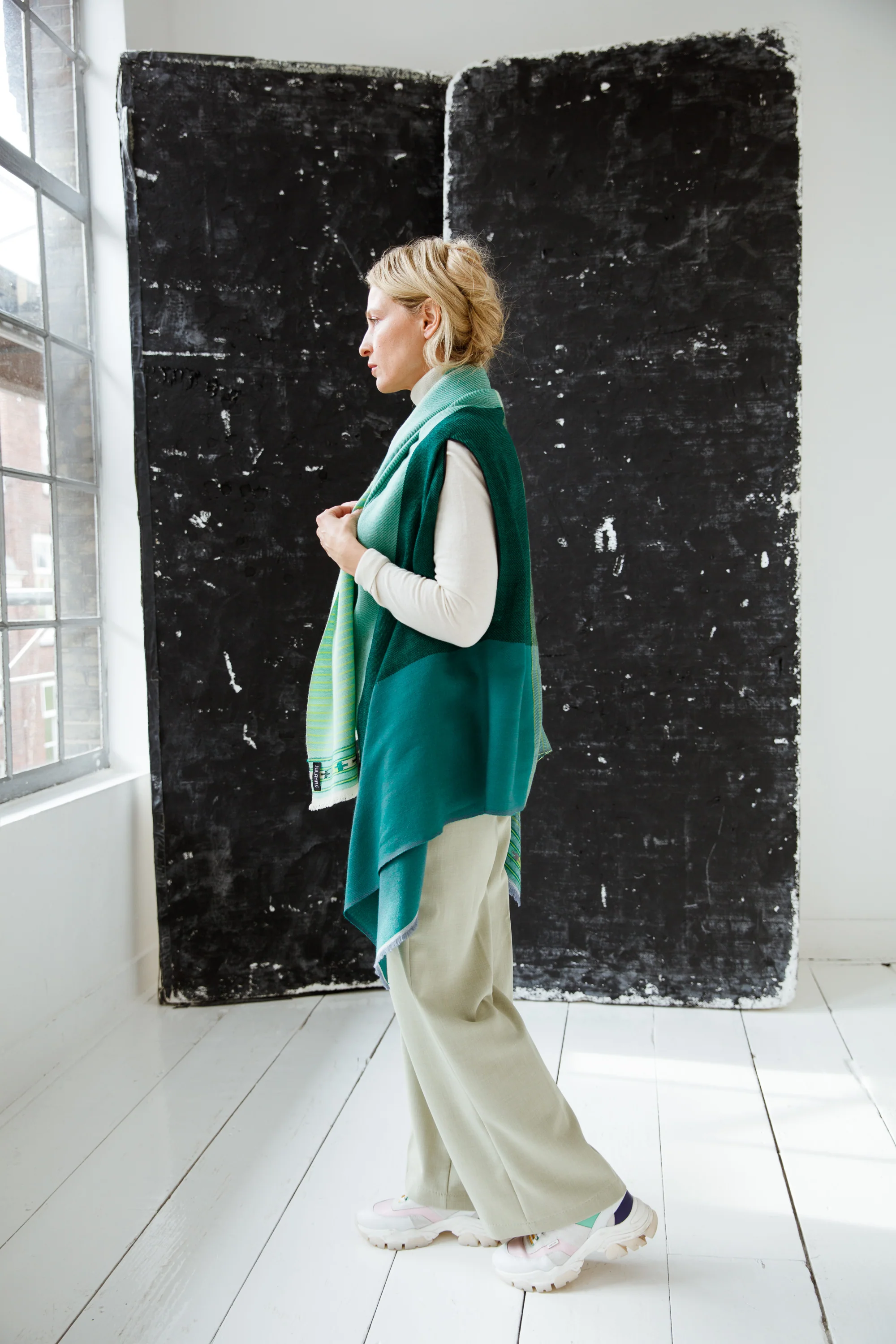 The clever placement of the armholes allow you to wear your Cape in many wonderful ways to create new looks: the short way offers more fabric on top, like a scarf and the long way becomes an elegant poncho. You can even belt it if you want a dress!