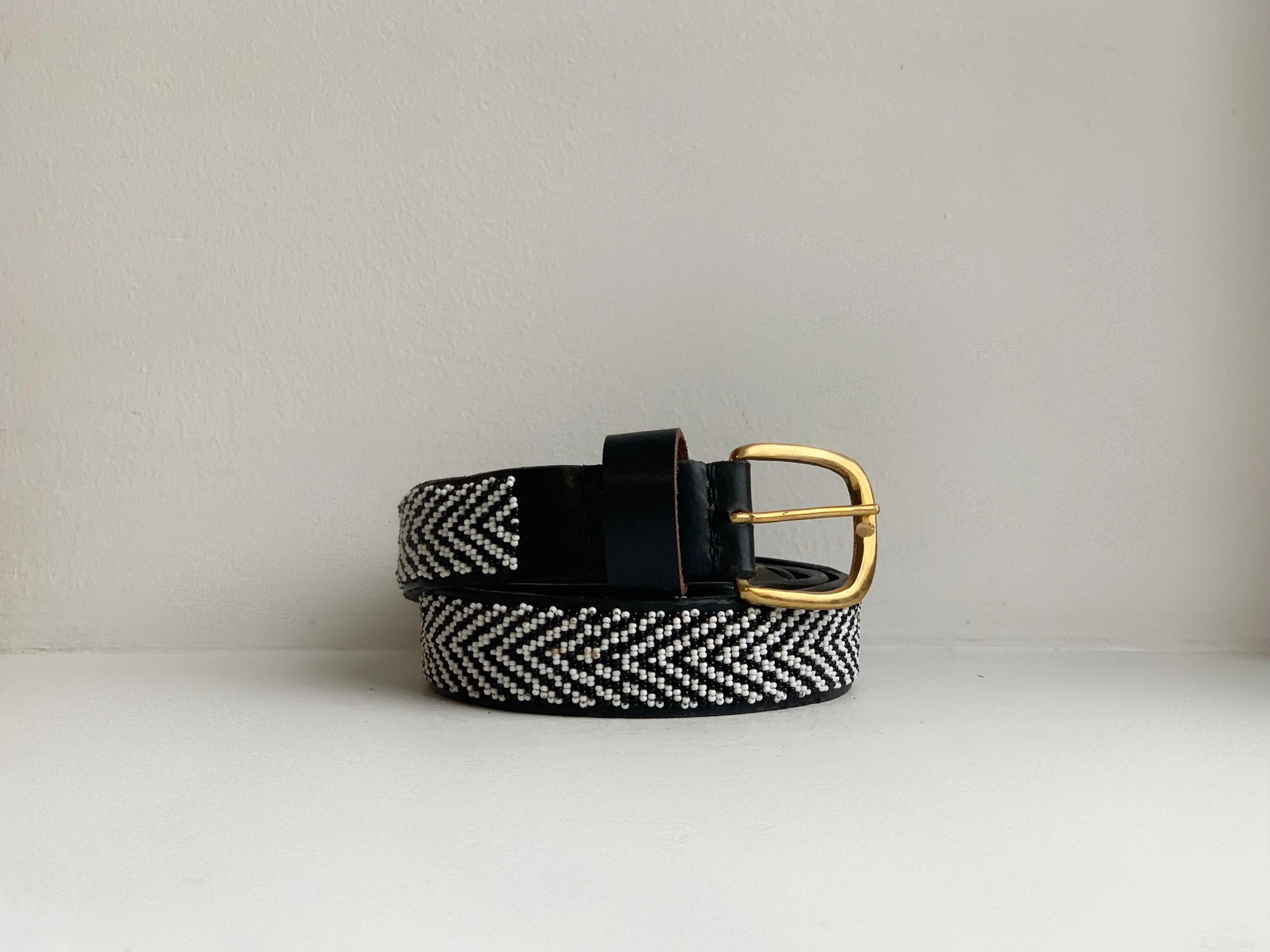 Beautifully hand-beaded by a Maasai women's collective in Kenya. Made with Kenyan leather, glass beads and a brass buckle.